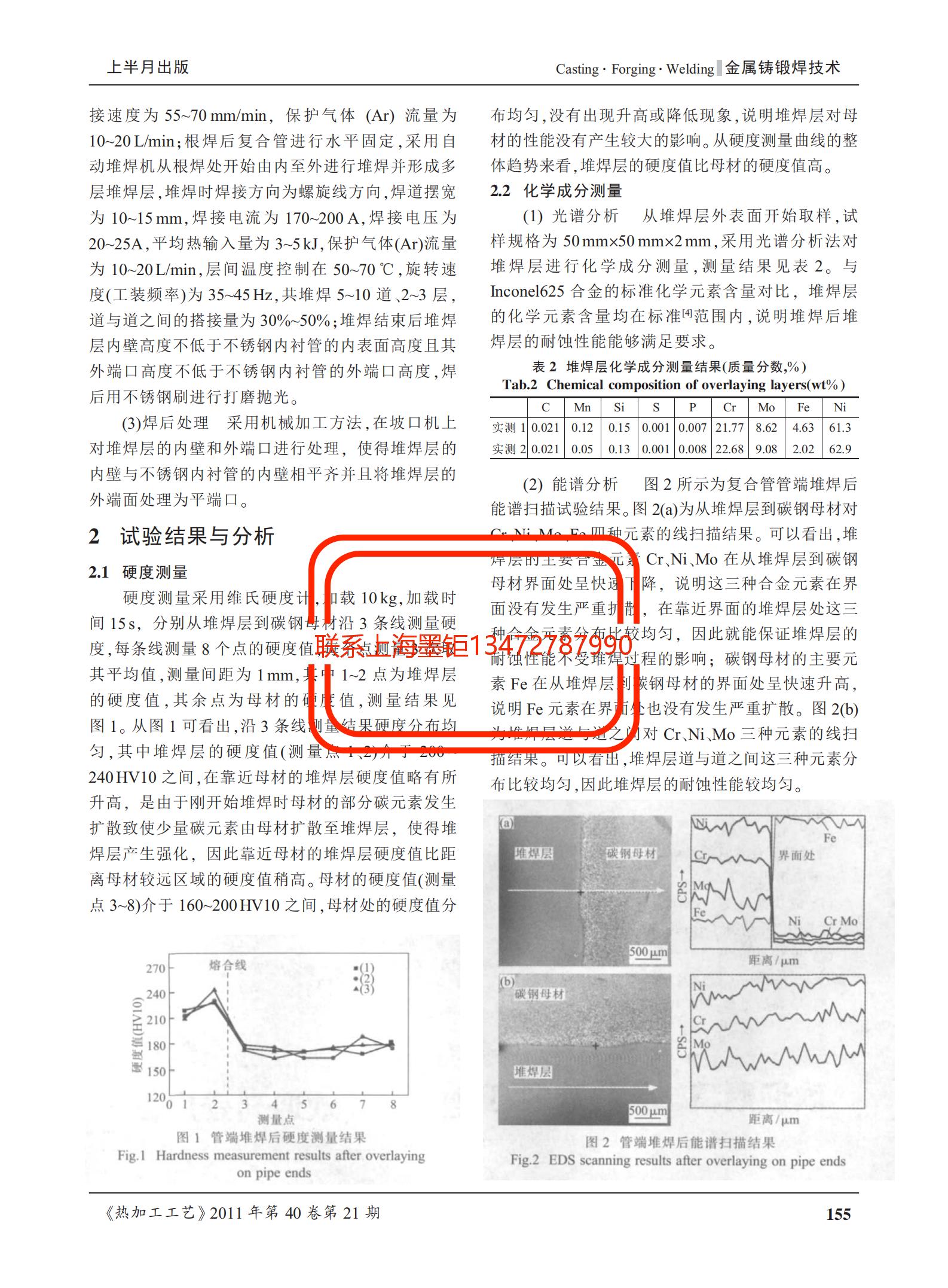 技术文章 复合管管端堆焊Inconel625合金工艺及性能研究 更新时间 2021-07-12 10:08:21 阅读 780 上一篇:Inconel600合金材料的焊接工艺 下一篇:Inconel600复合钢板焊接接头结构的改进
