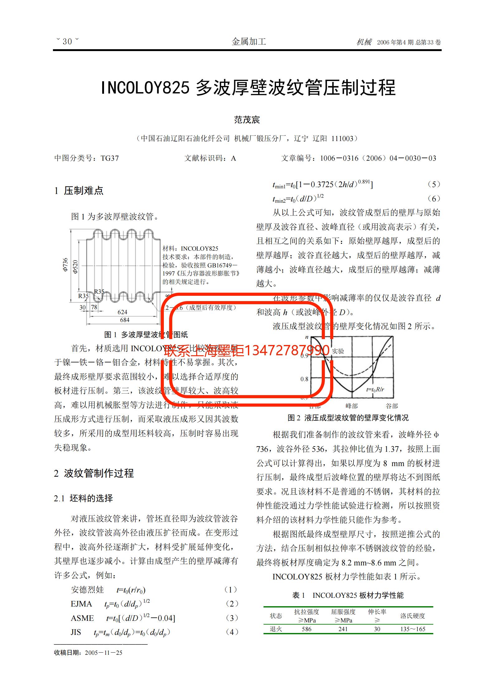 技术文章 INCOLOY825多波厚壁波纹管压制过程 更新时间 2021-07-13 06:48:56 阅读 813 上一篇:第一降温器Inconel600_Q345镍基复合钢板的焊接 下一篇:Incoloy825高压空冷丝堵泄漏分析及处理